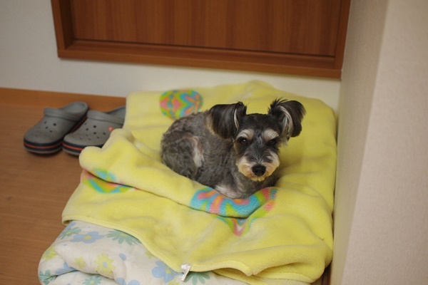 ルルちゃん、待っている間は、毛布の上でまったり。