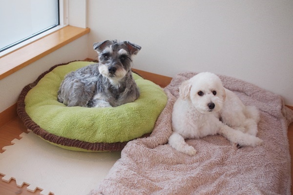 ミニチュアシュナウザーの福ちゃんとトイプードルのマハロちゃんです。