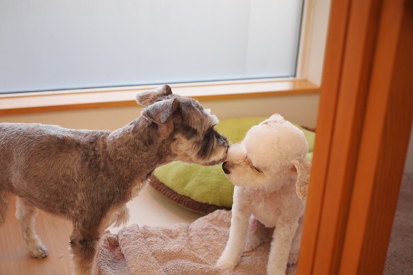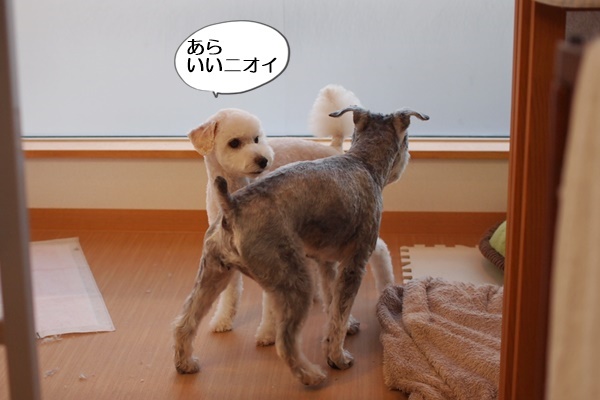 お互いのニオイが変わったのが気になるのか、2頭は急にニオイ嗅ぎ大会を繰り広げていました。