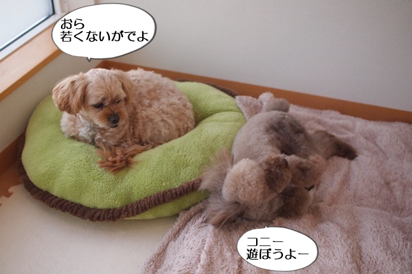 ヤマトちゃんが座布団で待っていると、コニーがするするーっとやって来ました。