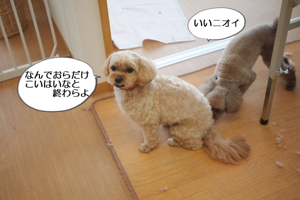シャンプーブローが終わると、お互いのニオイを嗅ぎ合ってました。