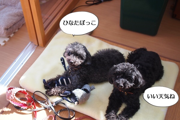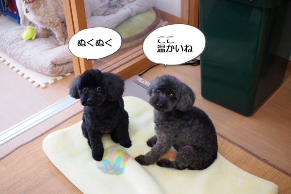 レアンちゃん達が座っているのは、ホットカーペットの上の毛布なので1番温かい場所です。