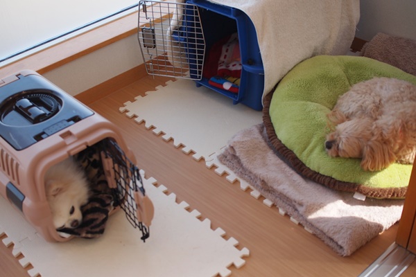 写真を構えるとソラちゃんがハウスから出てきましたが、それまではみんな寝てました。