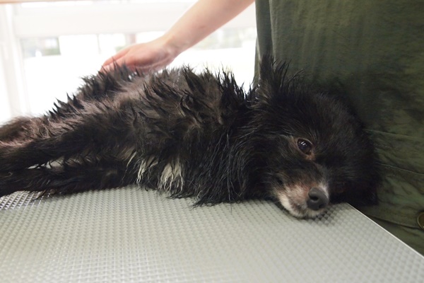 クマちゃんも獅子丸ちゃん同様、顔が濡れているのが嫌みたくて、テーブルに乗った途端タオルにごしごしが始まります。