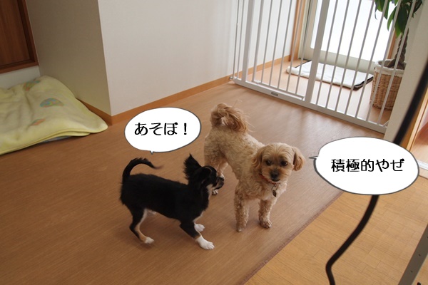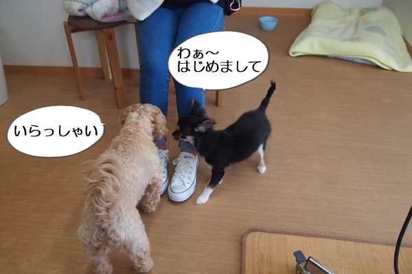 初めは看板犬コニーの勢いにビビッて尻尾を丸めていましたが、徐々に興味を示すように。