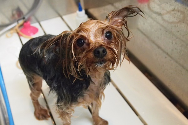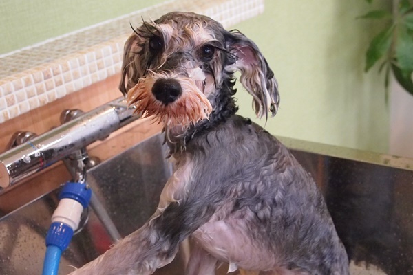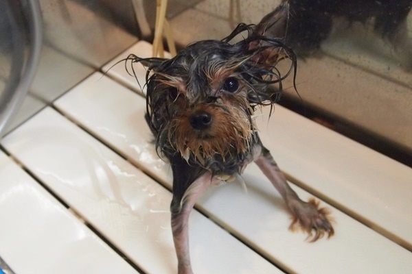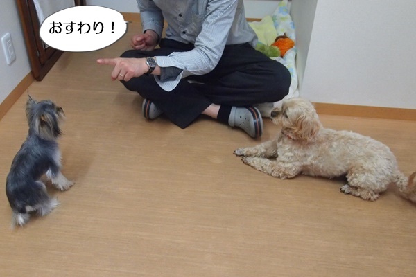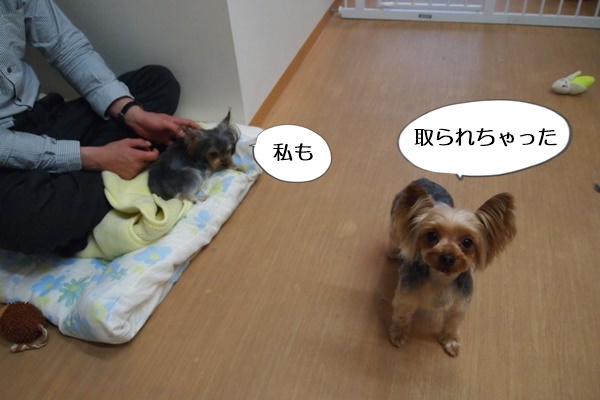 ルルちゃんのシャンプー中、リルちゃんは主人のしつけ大会に巻き込まれていました。