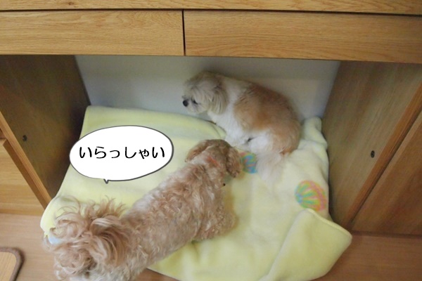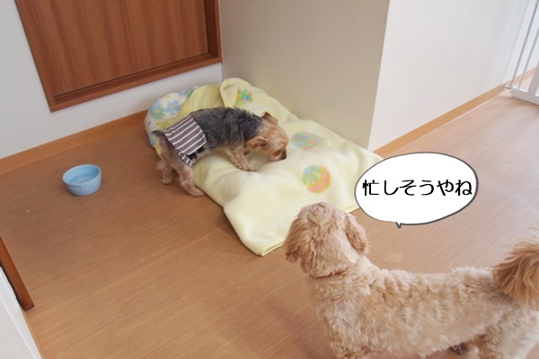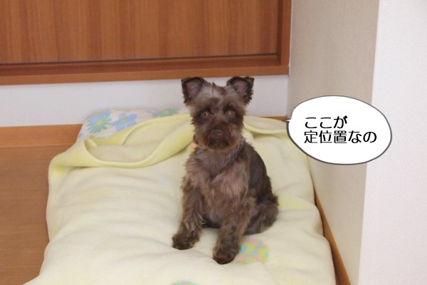 机の下にいつもの毛布を用意するのを忘れていて、床の上で小さくなってました。
