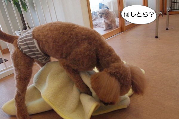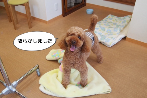 ブロー後の休憩中、ココアちゃんはあっという間に毛布をぐちゃぐちゃに(笑)。