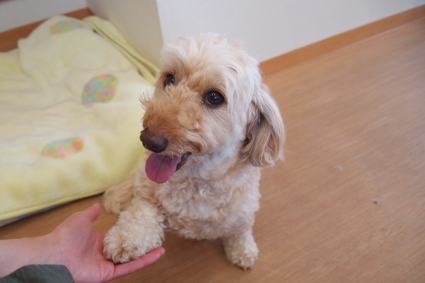 もこちゃん、お得意の「言われなくてもお手」を披露。
