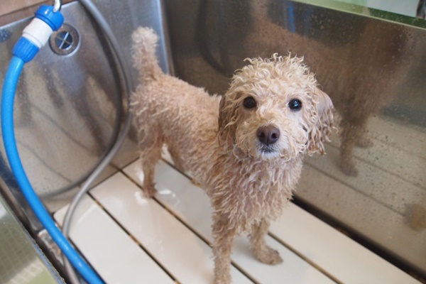 以前は、特にお顔のシャンプーが苦手で、立ち上がってしまってたのになぁ。