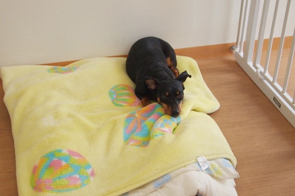 まだ心を開いてはくれませんが、毛布の上で丸まってくれるようになりました。