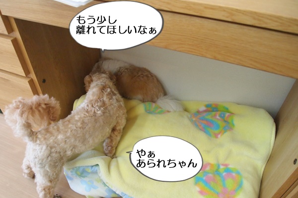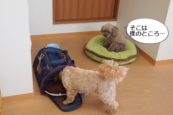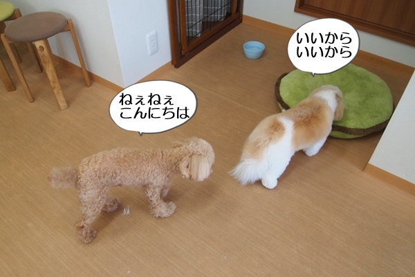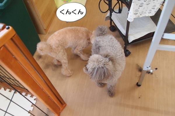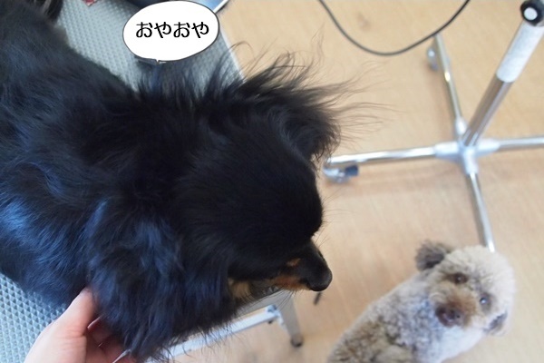 あんこちゃんのブロー中、下で一生懸命アピールしているのが、トイプードルのライチちゃんです。