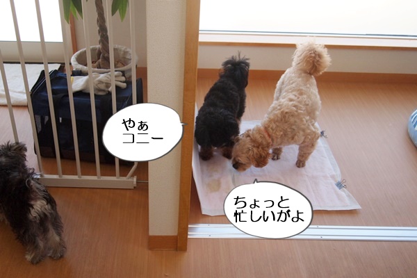 ラプちゃんとコニーは顔を付き合わせて、おしっこ大会を繰り広げていました。
