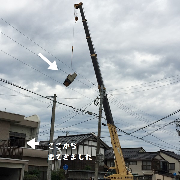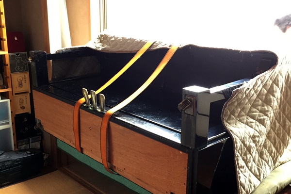 このピアノがあったのが実家の2階で、今の家の2階に入れるため、どちらもクレーンが必要です。