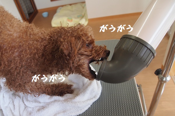 お尻の方を乾かしている時は大丈夫なのですが、体半分より頭側を乾かす時に風をかじろうとするんです。