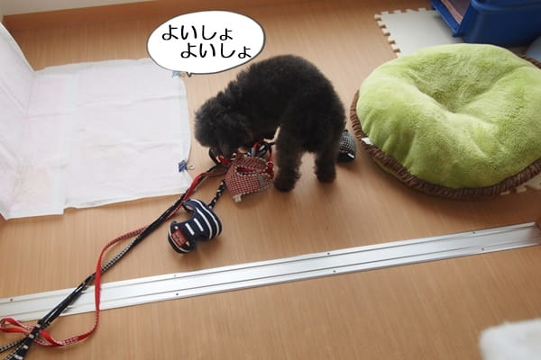 待っている間、レアンちゃんは自分たちのリードを一生懸命運んでいました。