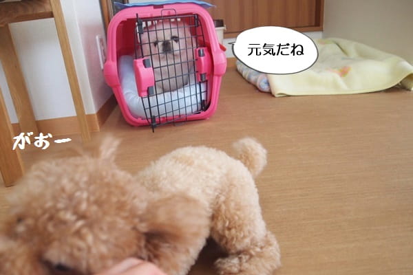 コニーが調子に乗ってモコちゃんにぐいぐい行っていたら、見事に怒られていました。