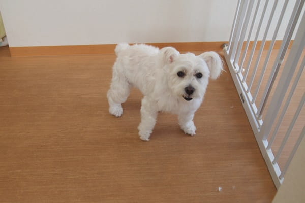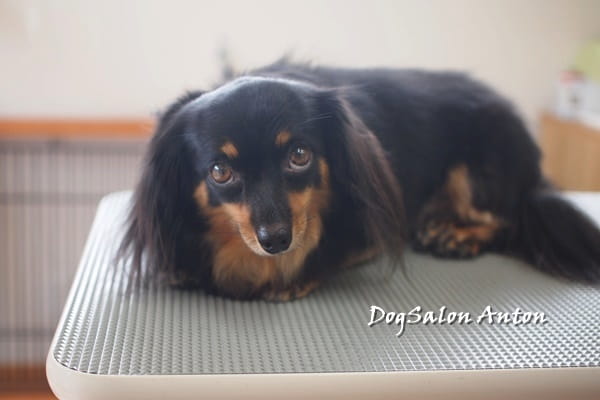 トリミングテーブルから降りたくてそわそわしているのに、「おすわり」と言うと、条件反射のように座ってくれます。