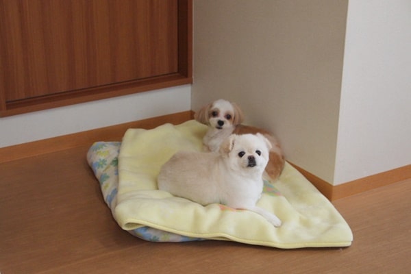 マルシーズーのモコちゃんと、ポメペキのフウちゃんです。