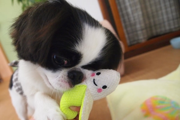 バナナの実の方を咬むとキュッキュと鳴って楽しいおもちゃなのですが、獅子丸ちゃんは皮を攻めてました。