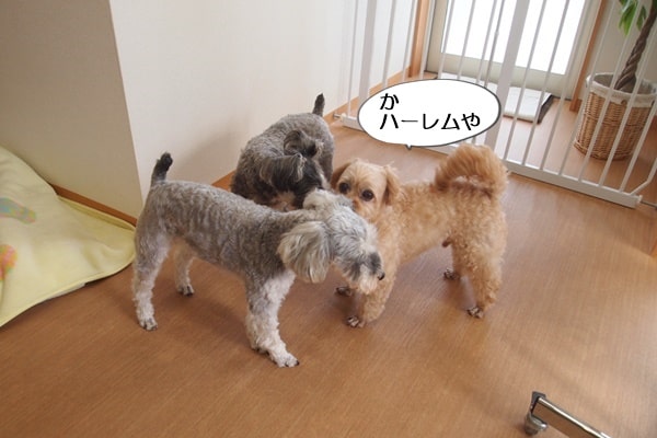 若い子に囲まれて、看板犬コニーおじさんは浮かれていました。