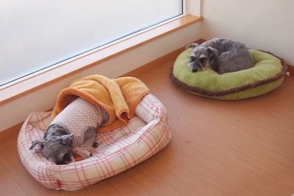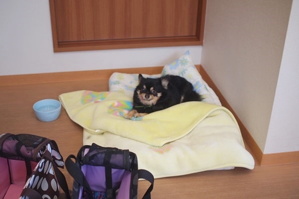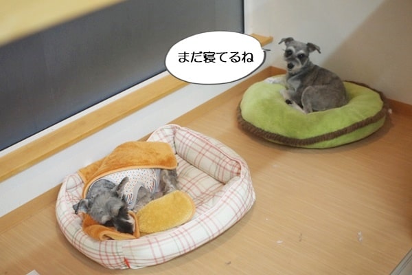 福ちゃんとマハロちゃんは、出ていく車を見送っていましたが、葉月ちゃんは持参のベッドの上。
