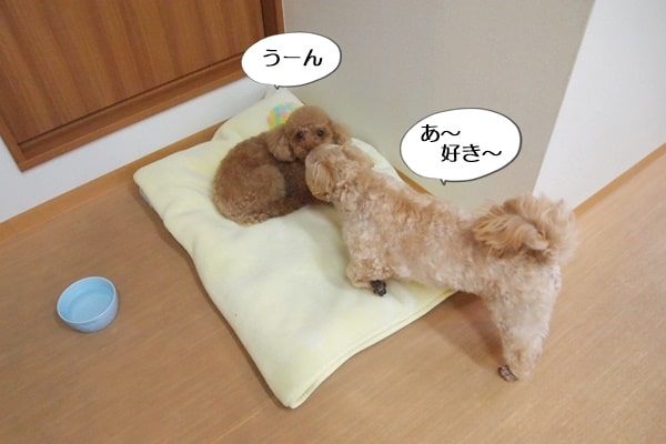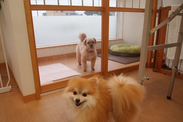 看板犬コニーは積極的ですが、モモちゃんは特に反応なし。