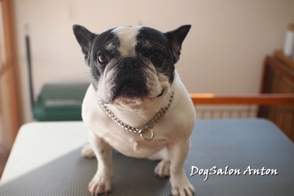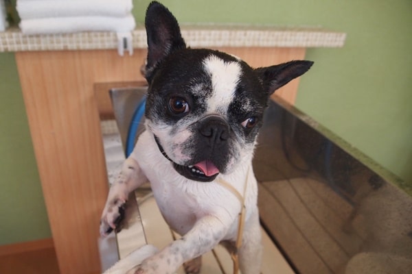 シャンプー後にシンクからテーブルに移動する際、はなちゃんは下で「遊ぼう遊ぼう」と必死のアピール。
