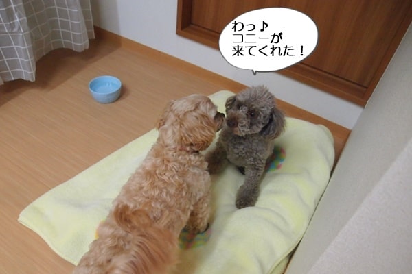 ライチちゃんは、看板犬コニーと遊びたくてたまらない様子。