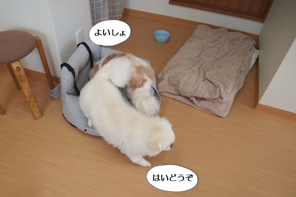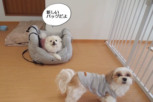 モコちゃんは、絶対にバッグに戻りたいらしく、フウちゃんが中にいても体をねじ込んでいました。