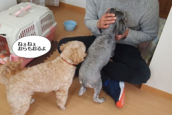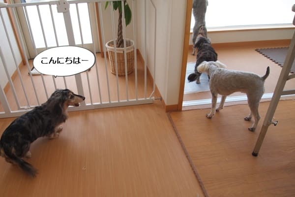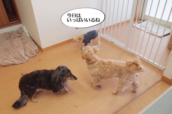 トロちゃんウニちゃんは、ダックス2頭に興味津々です。