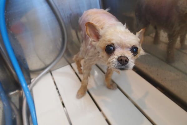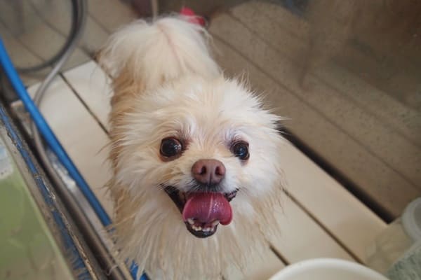 シャンプーをしようと近づくと、お腹を見せてました。