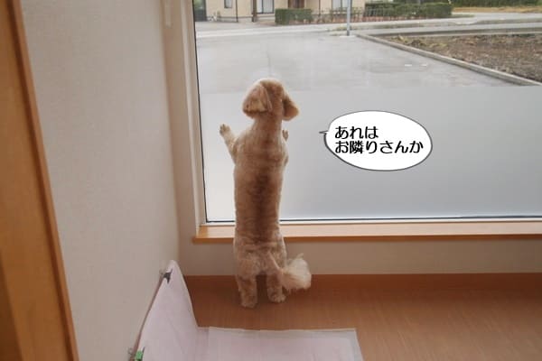 もこちゃんは、外を見て、こっちを見て、また外を見て。