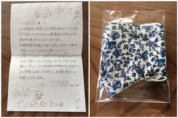 直筆の手紙と、手作りマスクが入っていたそうです。