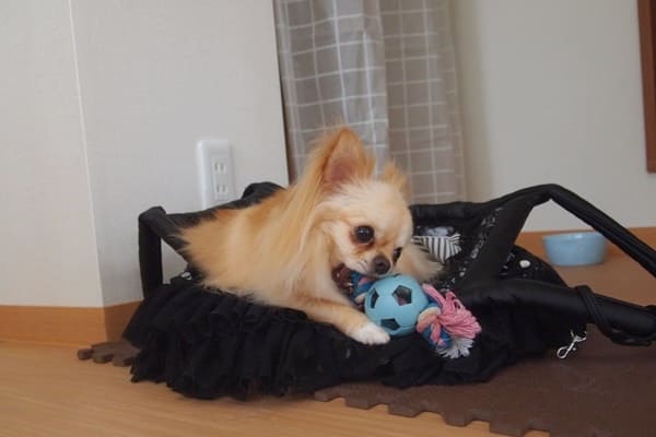 バッグの中に入っていたおもちゃを投げると、追いかけて1人でかじって楽しんでました。