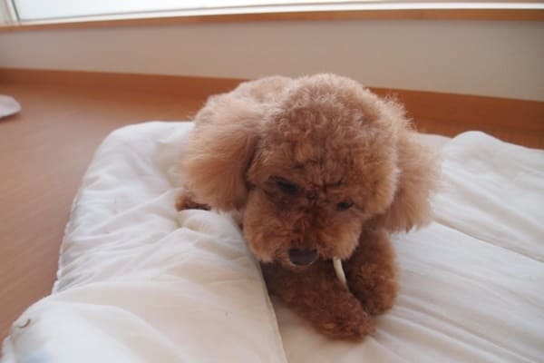 布団の所に誘導すると、嬉しそうにかじり始めました。