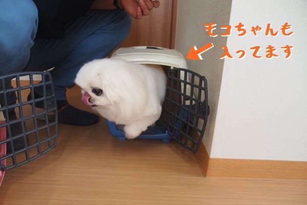 まるちゃんが落ち着きなかったので、お店にあるキャリーケースを出してみました。