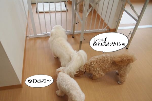 まるちゃんの見事な尻尾に頭を撫でられながら、ニオイチェック。