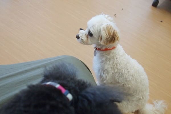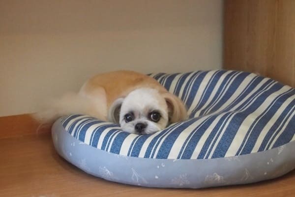ブローの時は、大抵そわそわしていますが、少しずつこんな風に伏せたり座ったりができるようになってきてますよ。