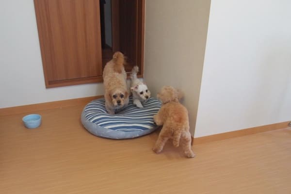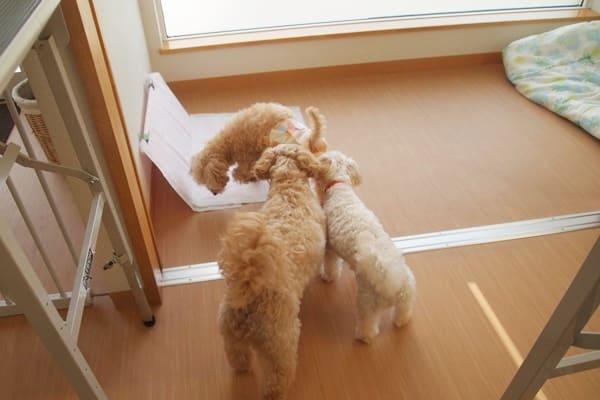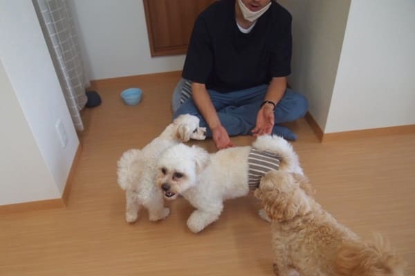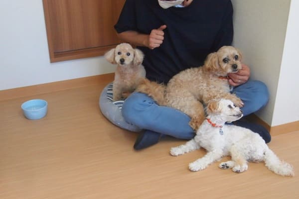 あんずちゃんだけは私のそばから離れなかったのですが、こころちゃん、コニー、ミラは主人の所へ。