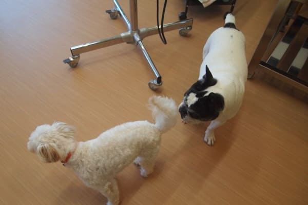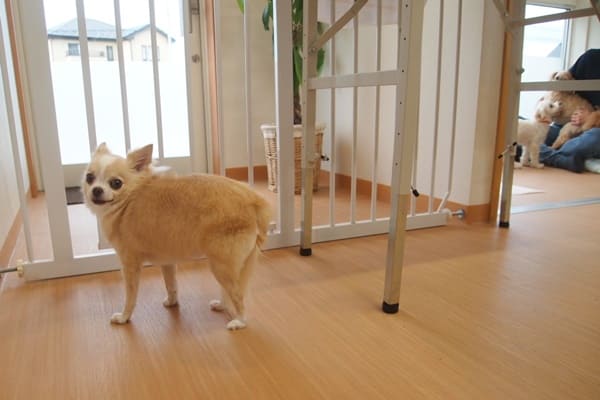 はなちゃんは、看板犬コニーにはあまり近づきませんが、ミラの方は気になるようです。