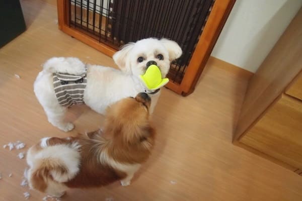 この2頭、1つのおもちゃでもケンカしないんですね。