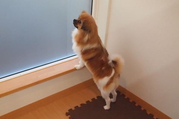 リルちゃんは、隅っこで外を見ようと頑張っています。