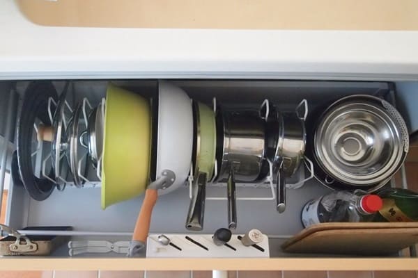 スペースが空いたので、下段の引き出しに入っていた、コニー&ミラごはん用の鍋も立てて収納できました。