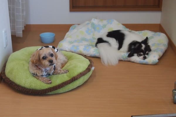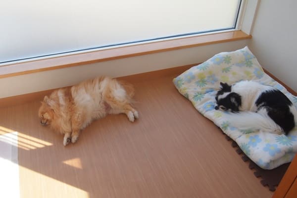 ハッピーちゃんは布団の上でゆっくりするのですが、モコちゃんはいつも床の上。