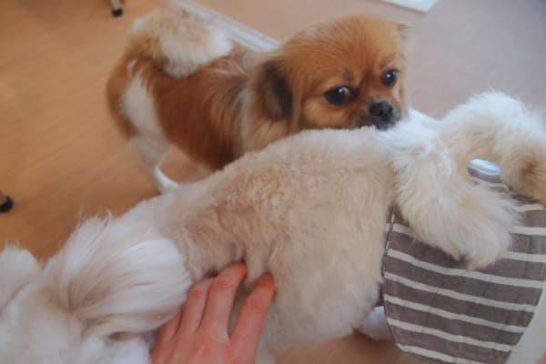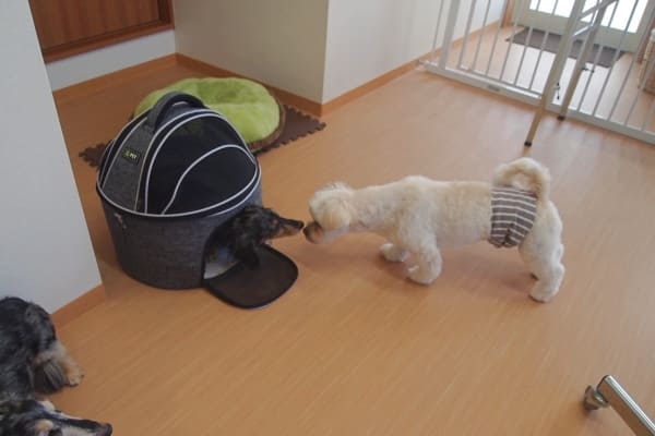 一方、ジニーちゃんはニオイを嗅がれると逃げ腰に。