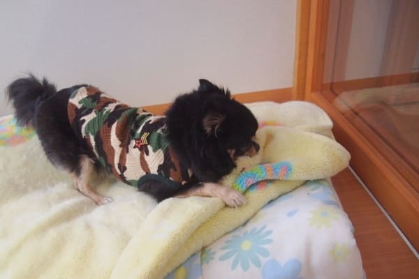 「さぁ帰ろう」という時になって、毛布で遊び始めるヤマトちゃん。