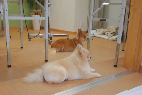 茶々ちゃんのトリミング中、「どこいった?」と思って下を見ると足元にいることがよくありました。