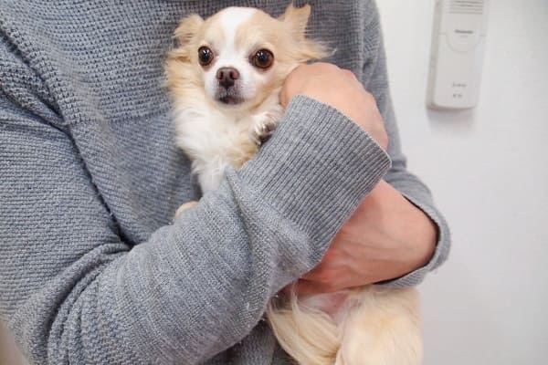 主人に抱っこされて緊張の面持ち。