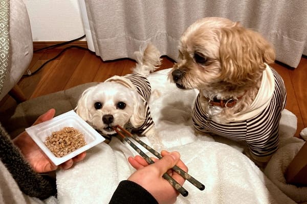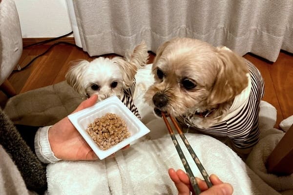 納豆の蓋をペリペリ開けるだけで、寝ていようが遊んでいようが、飛んでくる2頭。